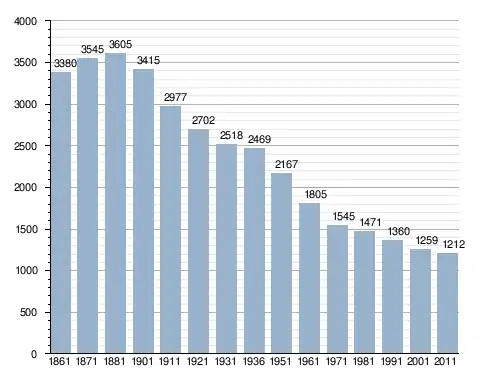 في سنة 1861 بلغ عدد السكان 3٬380 نسمة، وتطور العدد ليصل في سنة 2011 لـ 1٬212 نسمة.