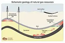 كما يوجد في أحجار تحتوي على النفط حيث عملت المؤثرات الحرارية والضغط على تولد الغاز فيها. وتوجد طبقات احجار الأردواز في مناطق عديدة وهي طبقية مصمتة أي لا تسمح بنفاذ الغاز منها. وتوجد تلك الطبقات بكميات كبيرة في الولايات المتحدة الأمريكية وكندا في أعماق نحو 1000 متر تحت الأرض. وحاليا تستخدم تقنية تحطيم الأحجار بواسطة الماء المضغوط من اجل احداث شقوق خلال المسام المحتوية على الغاز.