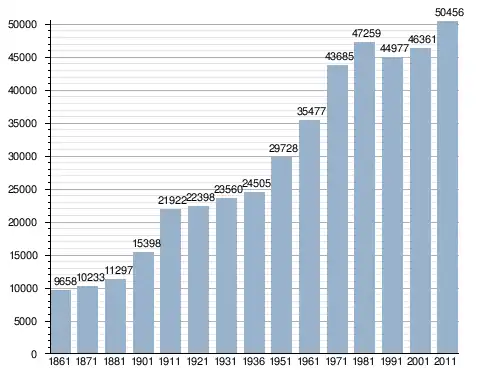 في سنة 1861 بلغ عدد السكان 9٬658 نسمة، وتطور العدد ليصل في سنة 2011 لـ 50٬456 نسمة.