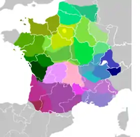 ![]() المنطقة التاريخية لتطور الغالو رومانسية المحصورة (لغات أويل والبروفنسالية الفرنسية واللغات الأوكسيتانية). | ||||