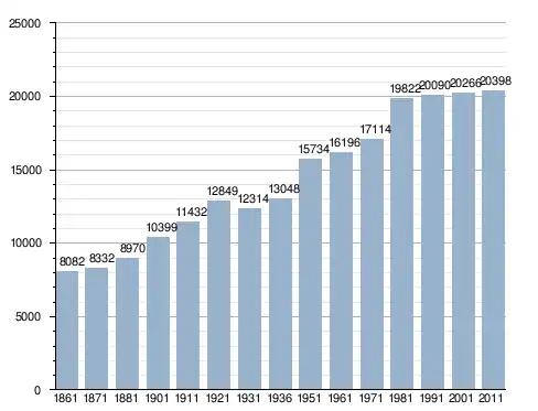 في سنة 1861 بلغ عدد السكان 8٬082 نسمة، وتطور العدد ليصل في سنة 2011 لـ 20٬398 نسمة.