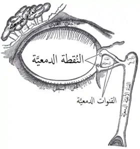 ![]() جهاز الدمع. أ = غدة دمعية ب = النقطة الدمعية العليا ت = القناة الدمعية العليا ث = كيس الدمع ج = النقطة الدمعية السفلى ح = القناة الدمعية السفلى خ = القناة الأنفية الدمعية جهاز الدمع. أ = غدة دمعية ب = النقطة الدمعية العليا ت = القناة الدمعية العليا ث = كيس الدمع ج = النقطة الدمعية السفلى ح = القناة الدمعية السفلى خ = القناة الأنفية الدمعية | |