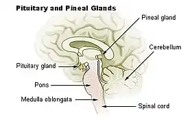 ![]() رسم توضيحي للغدة النخامية والغدة الصنوبرية. رسم توضيحي للغدة النخامية والغدة الصنوبرية. | |