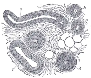 | تكوين الوحدة الإفرازية | طبقة واحدة مؤلفة من خليط من الخلايا الرائقة والخلايا القاتمة | خلايا عمودية ذات طبقة واحدة [16] |