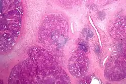 تنقسم الغدة داخليًا إلى فصيصات. تدخل الأوعية الدموية والأعصاب إلى الغدد من النقير وتتفرع تدريجياً إلى الفصوص.
