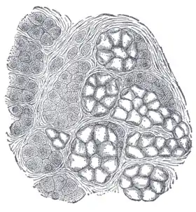![]() Human غدة تحت الفك السفلي. At the right is a group of mucous alveoli, at the left a group of serous alveoli | |