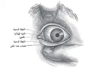 ![]() مقدمة العين اليسرى حيث جفنا العين مفصولان لإظهار لحاظ العين الوسطي وفتحة غدد الجفن (ميبوميوس). | |