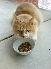 غذاء القطط هو الطعام المعد للاستهلاك من قبل القطط. كما هو الحال مع جميع الحيونات، القطط لديها متطلبات غذائية معينة من المفترض إضافتها إلى اطعمتها.[1] هنالك عناصر غذائية معينة؛ كالعديد من الفيتامينات، والأحماض الأمينية تتحلل بفعل الحرارة، والضغط، والعلاجات الكيميائية المستخدمة خلال عملية الإنتاج، وبالتالي يجب إضافتها بعد عملية الإنتاج لتفادي نقص التغذية، الذي قد يؤدي إلى مضاعفات عديدة.[2][3] فعلى سبيل المثال حمض التورين المتواجد في اللحوم، يتحلل خلال عملية الإنتاج، لذا عادة ما يضاف حمض التورين الاصطناعي بعد عملية الإنتاج، حيث أن أي نقص طويل الأمد في هذا الحمض قد يؤدي إلى انتكاس الشبكية، وفقدان البصر، والسكتة القلبية.[4]