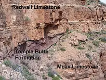 الطبقة التي تعلوها تتكون من تتلال متحجرة من حجر جيري أحمر Redwall Limestone يبلغ سمكها بين 400 - 800 متر (أنظر 4ب في الشكل 1 ). .[10] يتكون هذا الحائط الأحمر من حجر جيري بني اللون يتخلله حجر جيري ذو لون أزرق رمادي، بالإضافة إلى حجر الدولوميت مختلطا بأحجار إبرية بيضاء.[6] وقد ترسبت هذه في مياه ساحلية كانت بالقرب من خط الإستواء خلال 40 مليون سنة .[11] وتتنوع الإحفورات في تلك الطبقة فتجد فيها مرجانيات و حيوانات ذراعيات الأرجل ، ونباتات زنبقيات ، و شعب مرجانية، وحيوانات نوتويد ، و اسفنج بحري، هذا بالإضافة إلى كائنات بحرية مثل ثلاثية الفصوص "التريلوبايت" ، فقد كل هذه الإحفورات في طبقة الحائط الأحمر. .[6] وارتفع الغراند كانيون رويدا رويدا خلال عصر المسيسيبي وتآكلت أجزاء من الحائط الأحمر . وقد حصلت أسطح الحائط الأحمر على لونها من مياه الأمطار الهادرة من مناطق غنية بالحديد من طبقات معادن "سوباي" و "هرميت " تعلوها .[6]