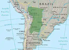 ![]() حدود تقريبية لمنطقة غران تشاكو، إلى الغرب جبال الأنديز، إلى الشرق نهر باراغواي، الحدود الشمالية والجنوبية غير واضحة المعالم. (خريطة مأخوذة من كتاب حقائق العالم). | |