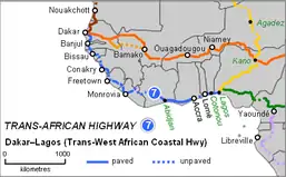 يعتبر الطريق الساحلي هو اهو الطريق الرئيسي حيث يربط 12 دولة ساحلية في غرب أفريقيا، من موريتانيا في الشمال الغربي إلى نيجيريا في الشرق، مع الطرق الفرعية الموجودة لاثنين من البلدان غير الساحلية، مالي وبوركينا فاسو.