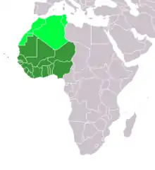 والدول الإسلامية في غرب أفريقيا هي: السنغال، غامبيا، مالي، موريتانيا، غينيا، النيجر، الساحل العلوي وثلثي المناطق الداخلية من سيراليون وداخل ليبيريا؛ والمناطق الغربية والشمالية والشرقية من بوركينا فاسو؛ والنصف الشمالية من نيجيريا، بنين، توغو، غانا وساحل العاج.[19]