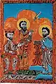 غريغوريوس المستنير والملك تيريديتس الثالث والمؤرخ آكاتانكيغوس . منمنمة أرمنية رسم فارطان من بدليس، 1569.