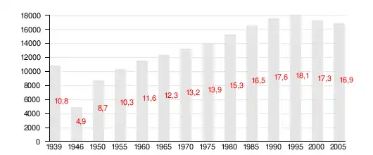 | 1946 | 4,900 | بعد طرد الألمان في الحرب العالمية الثانية وخسائر الحرب |