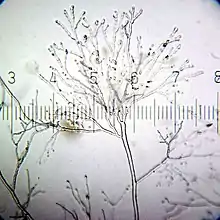 عرض مجهري آخر لغزل فطري تكتكات مرقمة تبلغ 230 µm كل على حدة.