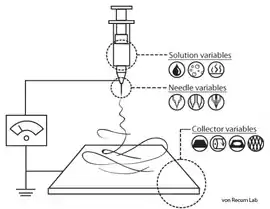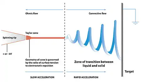 ![]() مخطط يظهر تشكل الليف خلال الغزل الكهربائي |