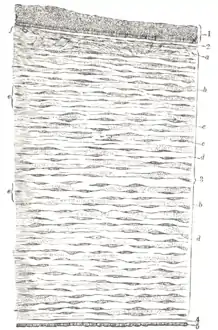1. الظهارة. 2. الصفيحة المرنة الأمامية. 3. المادة المخصوصة (السدى). 4. الصفيحة المرنة الخلفية. 5. بطانة القرنية من التجويف الأمامي. a. ألياف مائلة في الطبقة الأمامية من المادة المخصوصة. b. صفائح ألياف متقاطعة، مما ينتج عنه ظهور منقط. c. كريات القرنية تظهر بشكل مغزلي في المقطع. d. صفائح ألياف متقاطعة طوليًّا. e. الانتقال إلى بياض العين، مع ارتجاف أكثر وضوحًا، ويعلوه ظهارة أكثر سُمكًا. f. قطع من الأوعية الدموية الصغيرة في جميع الأنحاء، بالقرب من حافة القرنية. | |