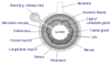 ![]() مقطع تشريحي ماخوذ من منطقة البواب في المعدة، تظهر فيها الطبقة المخاطية. | |