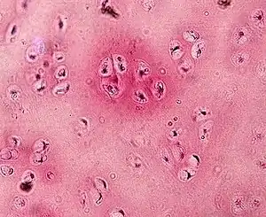 إذا تم فحص شريحة رقيقة من غضروف هياليني تحت المجهر، سيتم العثور على خلايا مستديرة شفافة (خلايا غضروفية) تتوسطها نوى قرنفلية اللون [2]، مرتبة في مجموعات من خليتين أو أكثر داخل نسيج بيني حبيبي أو متجانس غالبا.