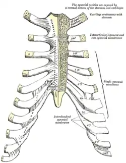 ![]() المفاصل القصية الضلعية و المفاصل بين غضاريف الأضلاع. (عرض أمامي) المفاصل القصية الضلعية و المفاصل بين غضاريف الأضلاع. (عرض أمامي) | |