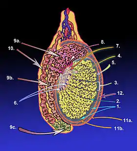 ![]() مخطط يوضح المكونات الرئيسية في خصية إنسان بالغ وتتضمن الأجزاء المؤشرة كما يلي: 1. الغلالة البيضاء، 2. حاجز، 3. فصيص، 4. منصف الخصية، 5. نبيبات ناقلة للمني، 6. نبيبات مستقيمة ناقلة للمني، 7. شبكة خصيوية، 8. قنيات الخصية الصادرة، 9a. رأس البربخ، 9b. جسم بربخ، 9.c ذيل البربخ، 10. أسهر, 11a. الغلالة الغمدية (الصفيحة الجدارية)، 11b. الغلالة الغمدية (الصفيحة الحشوية)، 12. تجويف الغلالة الغمدية. | |