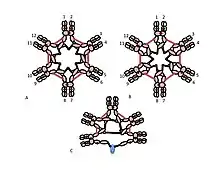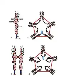 دور السيستين في المجال Cμ3 هو أكثر دهاء. ويمثل الشكلان 1C و 1D نماذج ممكنة لـ IgM الخماسية. ويتوخى في هذه النماذج ربط سلسلة μ سلسلتين μ آخرين. ومع ذلك، لا يمكن لأي من النموذجين وحدهما أن يفسرا بشكل كامل هيكل البوليمرية IgM. فعلى سبيل المثال، يتنبأ النموذج الوارد في الشكل 1C بأن رابطة التكبيد بين نطاقات Cμ2 ضرورية لصنع بوليمرية مستعبدة من مادة الـ "IgM" ذات الكبريتيد. ويتنبأ النموذج في الشكل 1D بأن رابطة التكلفيد بين مجالات Cμ3 أمر ضروري. في الواقع مستعبدين من كبريتيد، بوليمرية، يمكن أن لا يزال يتم إجراء IgM إذا كان أي واحد من cysteines الثلاثة غير موجودة. في سياق النماذج التي تتفاعل فيها كل سلسلة μ مع سلسلتين μ أخرى فقط، تشير هذه النتائج إلى أن بعض الجزيئات تشبه الشكل 1C وبعضها مثل الشكل 1D. غير أن توافر ثلاث cysteines للترابط بين μ السلسلة يشير إلى أن سلاسل μ قد تربط كل منها ثلاث سلاسل μ أخرى، كما هو موضح في الشكل 2. وبنفس الروح، يقدم الشكل 2C نموذجًا لخمامر يحتوي على سلسلة J يعكس الأدلة على أن سلسلة J تنضم إلى سلاسل μ التي لم يتم ربطها بسلاسل μ أخرى من قبل cysteines في مجالات Cμ3. وتناقش هذه وغيرها من النماذج، على حد سواء العادية وغير النظامية في مكان آخر.