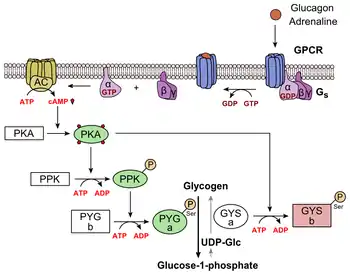 تقوم محلقة الأدينيلات بتصنيع أدينوسين أحادي الفوسفات الدوري (AMP أو cAMP)، الذي ينشط بروتين كيناز A (بروتين كيناز المعتمد على cAMP). هذا الإنزيم، بدوره، ينشط كيناز فسفوريلاز، والذي يقوم بعد ذلك بفوسفوريلات الجليكوجين فسفوريلاز ب (PYG b)، وتحويله إلى الشكل النشط المسمى فسفوريلاز أ (PYG a). فسفوريلاز أ هو الإنزيم المسؤول عن إطلاق الجلوكوز 1- فوسفات من بوليمرات الجليكوجين. مثال على المسار سيكون عندما يرتبط الغلوكاغون ببروتين عبر الغشاء. تتفاعل بروتينات الغشاء مع Gɑβ𝛾. ينفصل Gɑ عن Gβ𝛾 ويتفاعل مع بروتين الغشاء. محلقة الأدينيلات (Adenylyl cyclase) تحفز تحويل ATP إلى cAMP. يرتبط cAMP ببروتين كيناز أ، والفوسفوريلات المعقد فسفوريلاز كيناز. [14] فسفوريلاز كيناز فسفوريلات فسفوريلاز فسفوريلاز. يقطع الفسفوريلاز الفسفوري وحدات الجلوكوز من الجليكوجين على هيئة جلوكوز 1 فوسفات. بالإضافة إلى ذلك، يتم ضبط التحكم المنسق في تحلل السكر وتكوين الجلوكوز في الكبد عن طريق حالة الفسفرة للأنزيمات التي تحفز تكوين منشط قوي لتحلل السكر يسمى الفركتوز 2،6-بيسفوسفات. [15] إن إنزيم بروتين كيناز أ (PKA) الذي تم تحفيزه بواسطة الشلال الذي بدأه الغلوكاغون سوف يفسفر أيضًا بقايا سيرين مفردة من سلسلة بولي ببتيد ثنائية الوظيفة تحتوي على إنزيمات الفركتوز 2،6-بيسفوسفاتيز و فسفوفركتوكيناز -2. ينشط هذا الفسفرة التساهمية التي بدأها الغلوكاغون الأول ويمنع الأخير. ينظم هذا التفاعل الذي يحفز الفركتوز 2،6-بيسفوسفات (منشط قوي لـ phosphofructokinase-1، الإنزيم الذي يمثل الخطوة التنظيمية الأولية لتحلل السكر) [16] عن طريق إبطاء معدل تكوينه، وبالتالي منع تدفق مسار تحلل السكر والسماح لتكوين السكر بالسيطرة. يمكن عكس هذه العملية في حالة عدم وجود الغلوكاغون (وبالتالي، وجود الأنسولين).