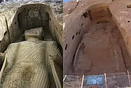 - تماثيل بوذا في باميان حيث يوجد تمثالان أثريان منحوتان على منحدرات وادي باميان في منطقة هزاراجات أو هزاراستان في وسط أفغانستان، ويعود تاريخ بنائها إلى القرن السادس قبل الميلاد وقد قامت عناصر طالبان بتدمير التمثالين باستخدام الديناميت في شهر مارس 2001 ويعتبر الموقع أحد مواقع اليونسكو للتراث العالمي منذ عام 2003م.[49][50]