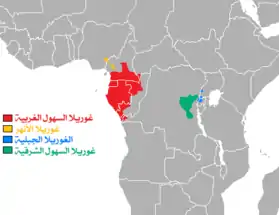 ![]() خريطة توضّح الانتشار الجغرافي لأنواع الغوريلا، ويظهر موطن الغوريلا الجبلية باللون الأزرق كبقعٍ صغيرة متناثرة في شرق أفريقيا | |