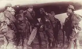 ![]() النقيب أوكوياما ميتشيرو (الثالث من اليسار) مع وحدة غيريتسو المحمولة جواً، يصافح النقيب سوابي شويتشي، قائد السرب المستقل الثالث، قبل وقت قصير من مغادرتهم لتنفيذ مهمتهم في أوكيناوا | |