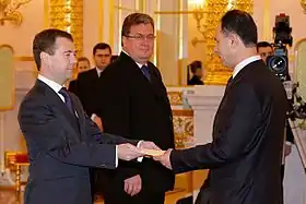 ![]() فائد مصطفى يقدم أوراق اعتماده إلى ديمتري ميدفيديف في 16 ديسمبر 2009 | |