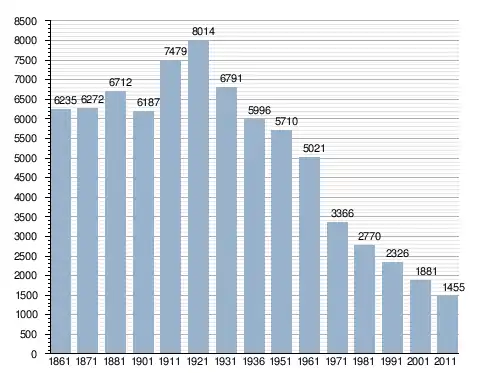 في سنة 1861 بلغ عدد السكان 6٬235 نسمة، وتطور العدد ليصل في سنة 2011 لـ 1٬455 نسمة.