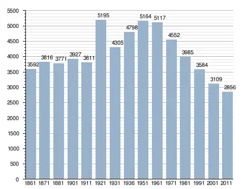 في سنة 1861 بلغ عدد السكان 3٬592 نسمة، وتطور العدد ليصل في سنة 2011 لـ 2٬856 نسمة.