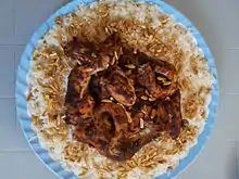 - الأصلية؛ يحمص العيش ويُغمر بالشوربة في طبق كبير عميق، ثم يغطى بالأرز المستوي، ويرش الأرز بقليل من الشوربة. تجهز التقلية على النار بتحمير الثوم المدقوق في الهاون مع مسحوق الكزبرة الجافة في الزبد، ثم يضاف معجون الطماطم وقليل من الماء والخل. ترش التقلية على الأرز، وتوزع قطع اللحم دائريا في الطبق. وهنيئا مريئا.