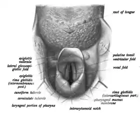 ![]() فتحة المزمار مبينة على الرسم تحت اسم (Rima glottidis). | |