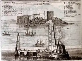 ![]() الجزائر في القرن السادس عشر، ويظهر أمامها الحصن الإسباني | |||||||||