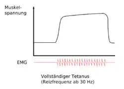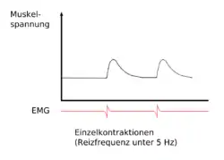 | تحفيز متكرر للعضلة، بتردد يسمح للعضلة بالانبساط. | تحفيز أسرع للعضلة، بحيث يحصل تكزز غير كامل. | تحفيز بتردد عالي للعضلة، يتسبب في تشنج (انقباض مستمر) للألياف العضلية. |