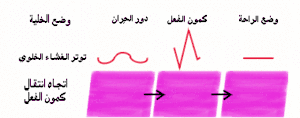 بمعنى آخر فإن الغشاء الخلوي يكون في وضع استقطاب سالب الشحنة هو وضع الراحة، ثم تمر عليه شحنة تخرجه من وضع الاستقطاب فيما يُدعى بإزالة الاستقطاب يتلوها عودة الاستقطاب وفرط استقطابي، ثم يعود إلى الاستقطاب الأصلي.