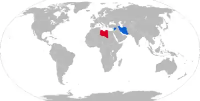 خريطة تظهر المستخدمون لفجر-5, المستخدمون الحاليون باللون الأزرق والسابقون بالأحمر