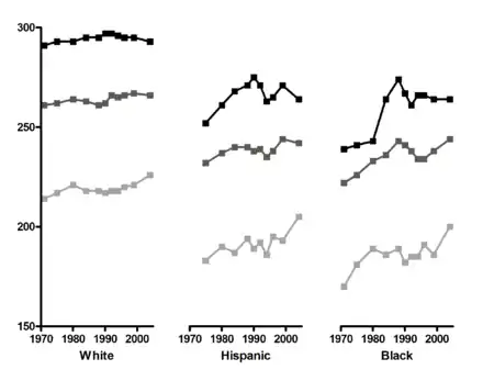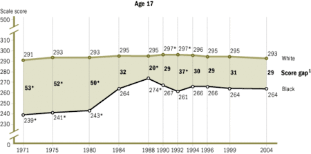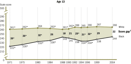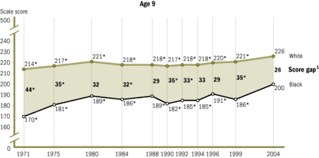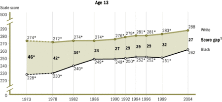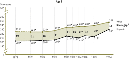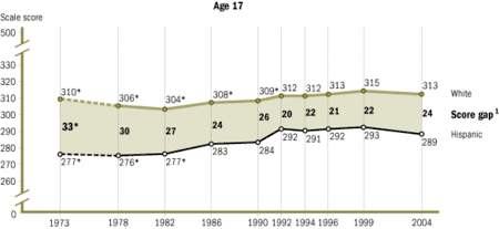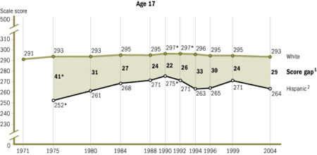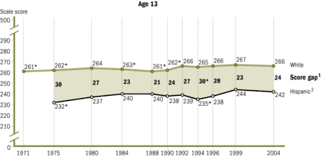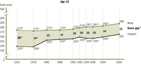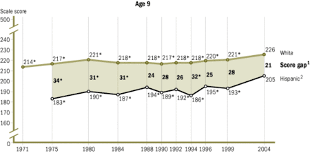 يمكن العثور على دليل على وجود فجوة في التحصيل باستخدام مقاييس مختلفة، ولكن أحد التقييمات المستخدمة على المستوى الوطني هو التقييم الوطني للتقدم التعليمي (NAEP). توضح الرسوم البيانية أدناه فجوة التحصيل في هذا التقييم بين الطلاب السود والبيض وبين الطلاب ذوي الأصول الأسبانية والبيض في الولايات المتحدة مع مرور الوقت. على الرغم من تضييق الفجوات عمومًا في السنوات الأخيرة وفقًا لهذا الإجراء المحدد، فمن الواضح أنه لا تزال هناك تباينات كبيرة بين المجموعات.