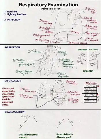 فحص الجهاز التنفسي يتم إجراء الفحص التنفسي كجزء من الفحص البدني،[1] أو عندما يتلقى المريض مشكلة تنفسية مثل( ضيق التنفس، والسعال، وألم في الصدر ) أو تاريخ يشير إلى وجود أمراض في الرئتين. وغالبا ما، يتم دمج فحص التنفس مع فحص القلب.