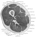 في القطاع العرضي لجزء من فخذ الإنسان، يظهر الفخذ منقسما لثلاث أجزاء مختلفة. يفصل بينهم طبقة من أنسجة ضامة. ولكل طبقة من الثلاث طبقات إمداد دموي وعصبي منفصل عن الآخر. ولكل منها أيضا العضلات الخاصة بها. ويعتبر عظم الفخذ هو مركز الأجزاء الثلاث