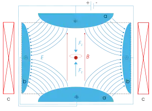 مخطط لفخ يحوي جزيء بشحنة موجبة (باللون الأحمر). أنقر لكي ترى المجالات المغناطيسية B (أحمر) والمجالات الكهربائية E (أزرق) .