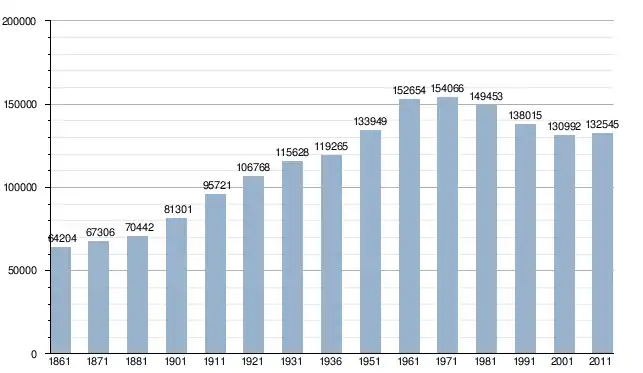 في سنة 1861 بلغ عدد السكان 64٬204 نسمة، وتطور العدد ليصل في سنة 2011 لـ 132٬545 نسمة.