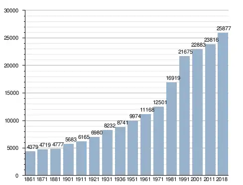في سنة 1861 بلغ عدد السكان 4٬379 نسمة، وتطور العدد ليصل في سنة 2018 لـ 25٬877 نسمة.