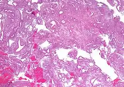 ![]() صورة مجهرية showing simple endometrial hyperplasia, where the gland-to-stroma ratio is preserved but the glands have an irregular shape and/or are dilated. خزعة بطانية رحمية. صبغة الهيماتوكسيلين واليوزين. صورة مجهرية showing simple endometrial hyperplasia, where the gland-to-stroma ratio is preserved but the glands have an irregular shape and/or are dilated. خزعة بطانية رحمية. صبغة الهيماتوكسيلين واليوزين. | |
