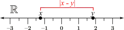 الفرق المطلق لهذه القيمة يصف المسافة على الخط الحقيقي بين نقطتان متناظرتان x,y وهو حالة خاصة من معيار متريLp-الفضاء لجميع قيم p (1 ≤ p ≤ ∞) يستخدم لجميع الأعداد الكسرية Q,و الأعداد الحقيقية R.[1][2]