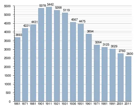 في سنة 1861 بلغ عدد السكان 3٬693 نسمة، وتطور العدد ليصل في سنة 2011 لـ 2٬600 نسمة.