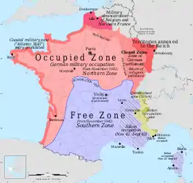 ![]() بالأزرق: أراضي الدولة الفرنسية (حكومة فيشي). بالأحمر: الأراضي الخاضعة للاحتلال الألماني. بالأصفر: الأراضي الخاضعة للاحتلال الإيطالي. | |||||||||||||||
