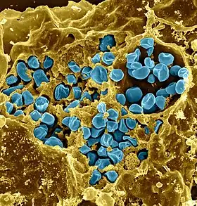 ![]() خلية بلعمية (أصفر) مصابة ببكتيريا الفرنسيسيلة التولاري (الأزرق). | |